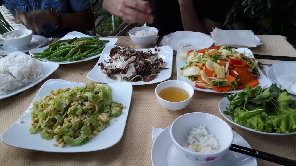 Nous avions faim et donc commandé un plat de viande chacun accompagnés d’un plat de légumes sautés en plus et 2 sortes de riz. Au total 130 000 dôngs chacun et le ventre bien rempli.