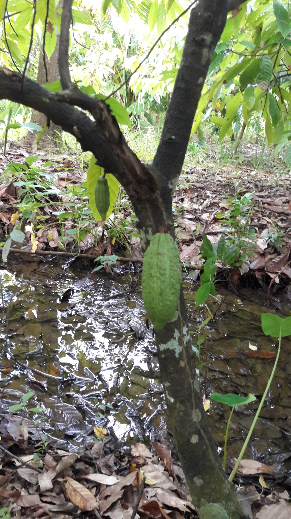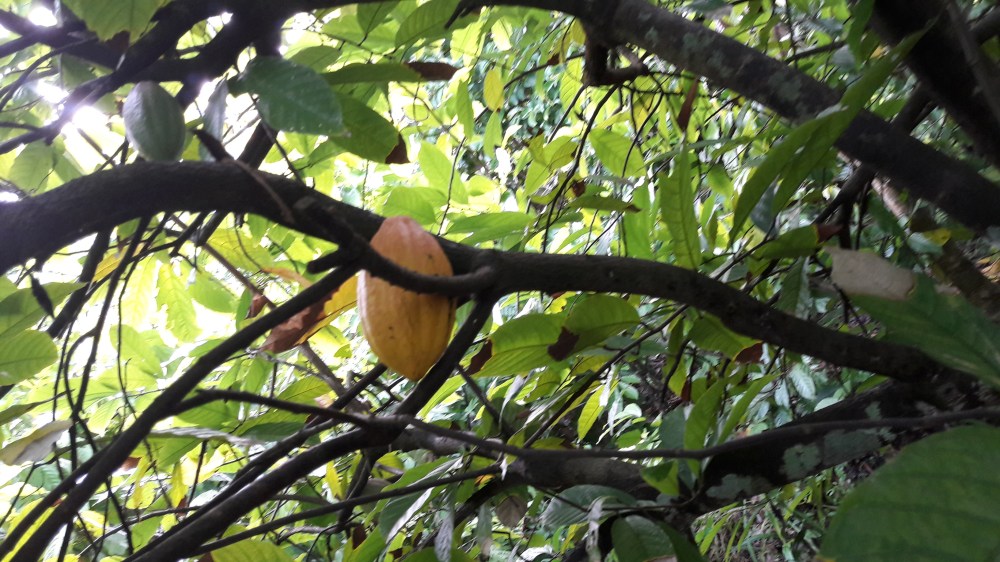 La reconnaissant, l’hôte de La maison du cacao nous autorise à entrer explorer une petite portion de son exploitation. Il a décidé, cette semaine, de réduire les visites au matin pour travailler sereinement sur son terrain qui dépasse l’hectare.
