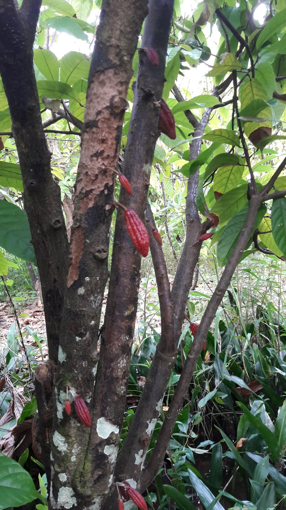 La promenade dans le jardin est courte mais je peux observer les 2 sortes de fruits portés par ces cacaoyers: les rouges et les verts.