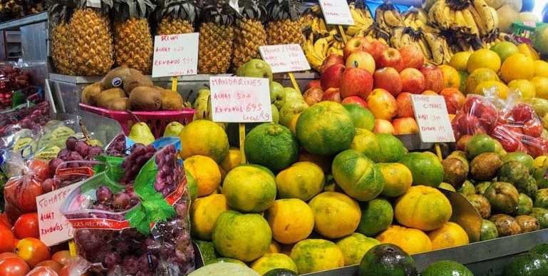 A 8h, je sortais du marché avec 6-7 kilos de fruits et légumes presque tous locaux. J’ai fait une entorse en prenant des tomates et avocats importés. J’avais eu la merveilleuse idée de rajouter 1,5 litres d’eau.