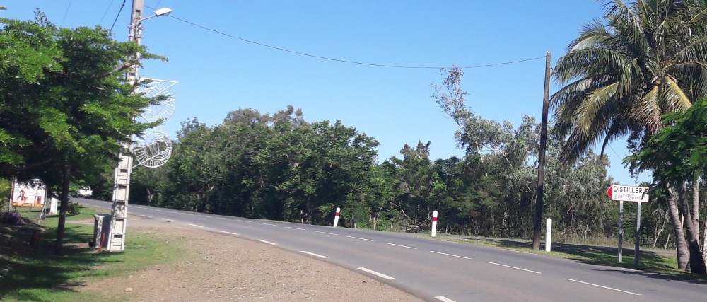Nous poursuivons vers la route de Poé avec une zone de ralentissement à 30 km/h et quelques dos d’âne. Quelques maisons sont visibles discrètement derrière les magnifiques arbres. Nous croisons pour la première fois des stands permettant aux habitants de la tribu de vendre quelques fruits.