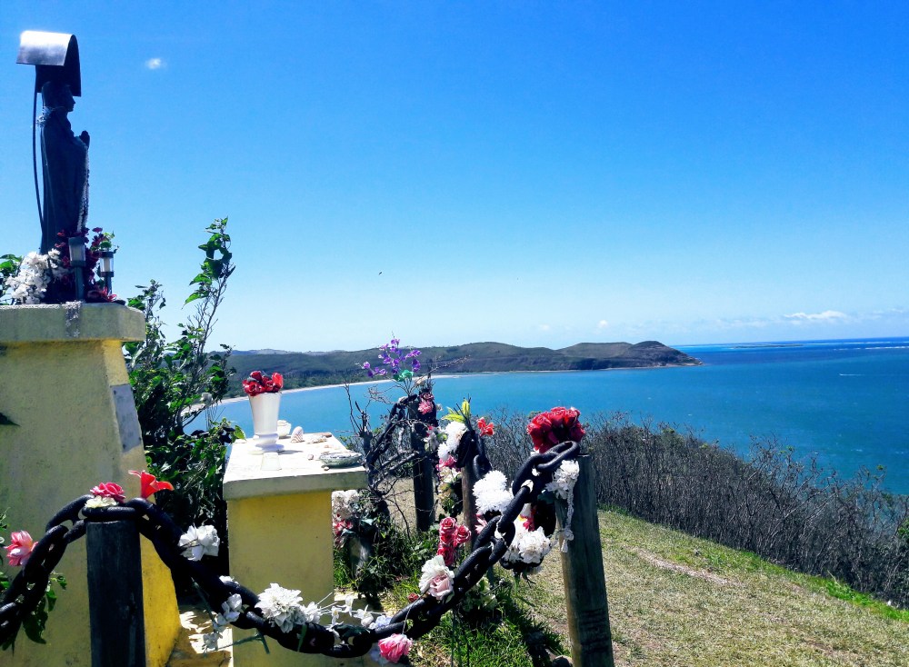 Avant de poursuivre le sentier, il est suggéré une incartade rapide vers une statue de la Vierge Notre Dame des flots. Avec ce magnifique temps, nous profitons de la vue sur le lagon et l’arrière pays avec le fleuve, la Nera, ondulant entre plaine et montagne avant de se jeter dans la mer.