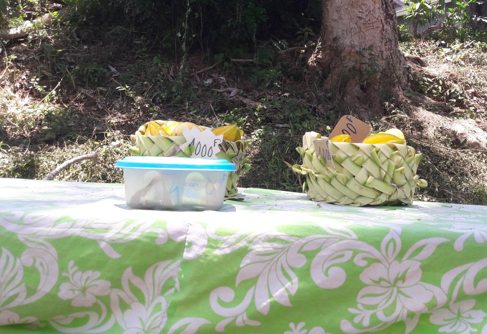 Ici, une panière mêlant mangues, pomme-liane (fruit de la passion), mangues pour 1000 francs. Nous avons opté pour le sac garni de mangues pour 500 francs qui nous a sauvé quelques repas. Les sous sont à déposer dans une boîte en plastique.