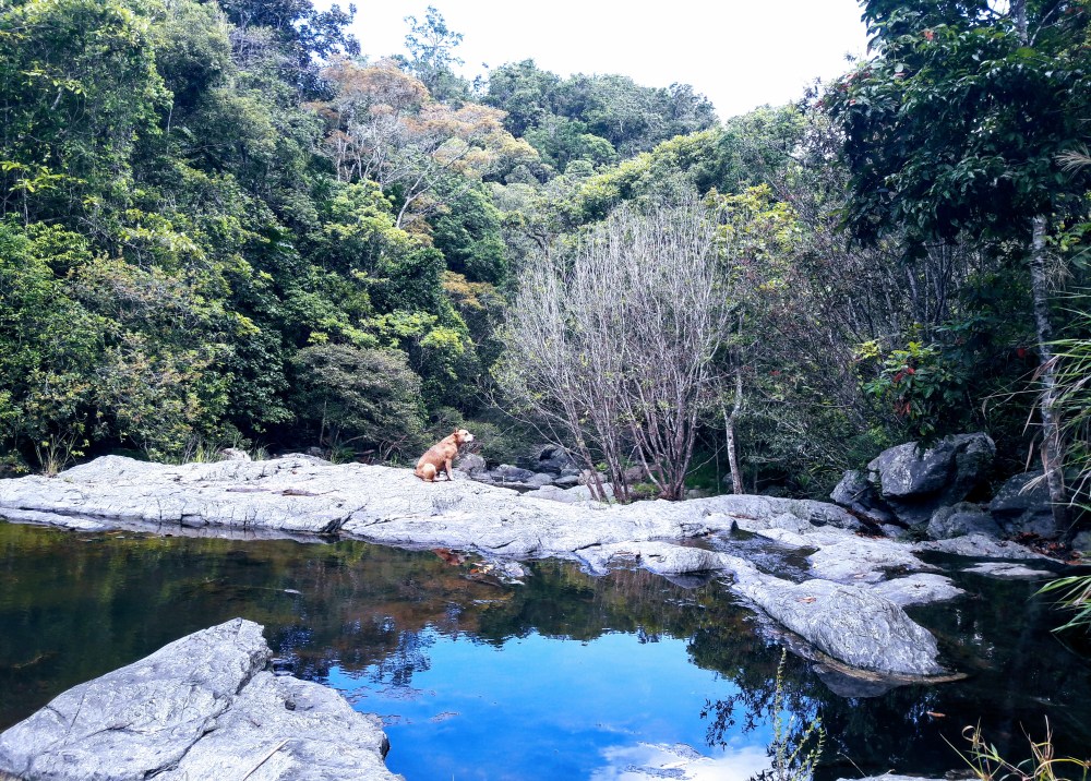 Comme nous l’ont raconté d’autres voyageurs, nous sommes escortées par une charmante chienne jusqu’à la cascade.